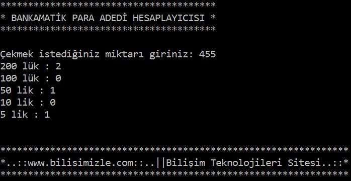 Console.WriteLine("* BANKAMATİK PARA ADEDİ HESAPLAYICISI *");