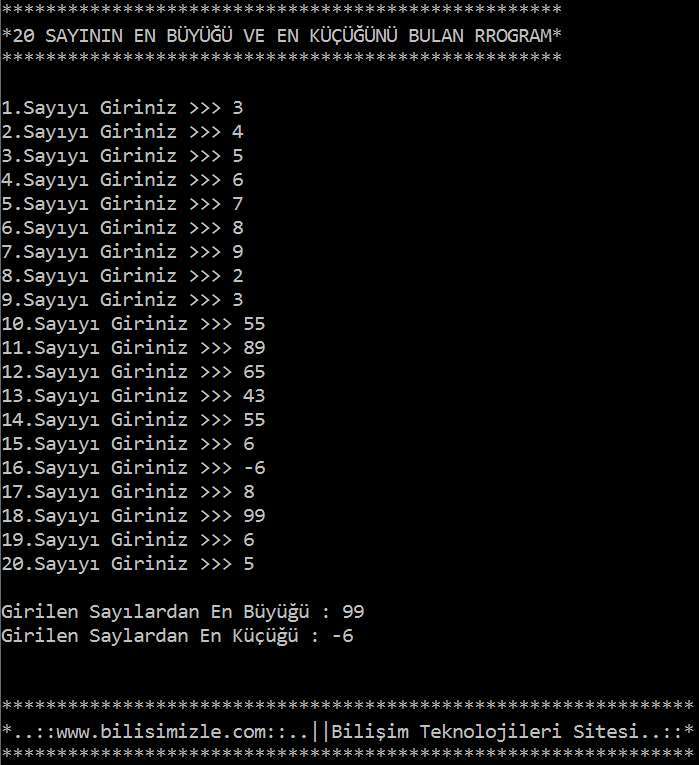 Console.WriteLine("*20 SAYININ EN BÜYÜĞÜ VE EN KÜÇÜĞÜNÜ BULAN PROGRAM*");